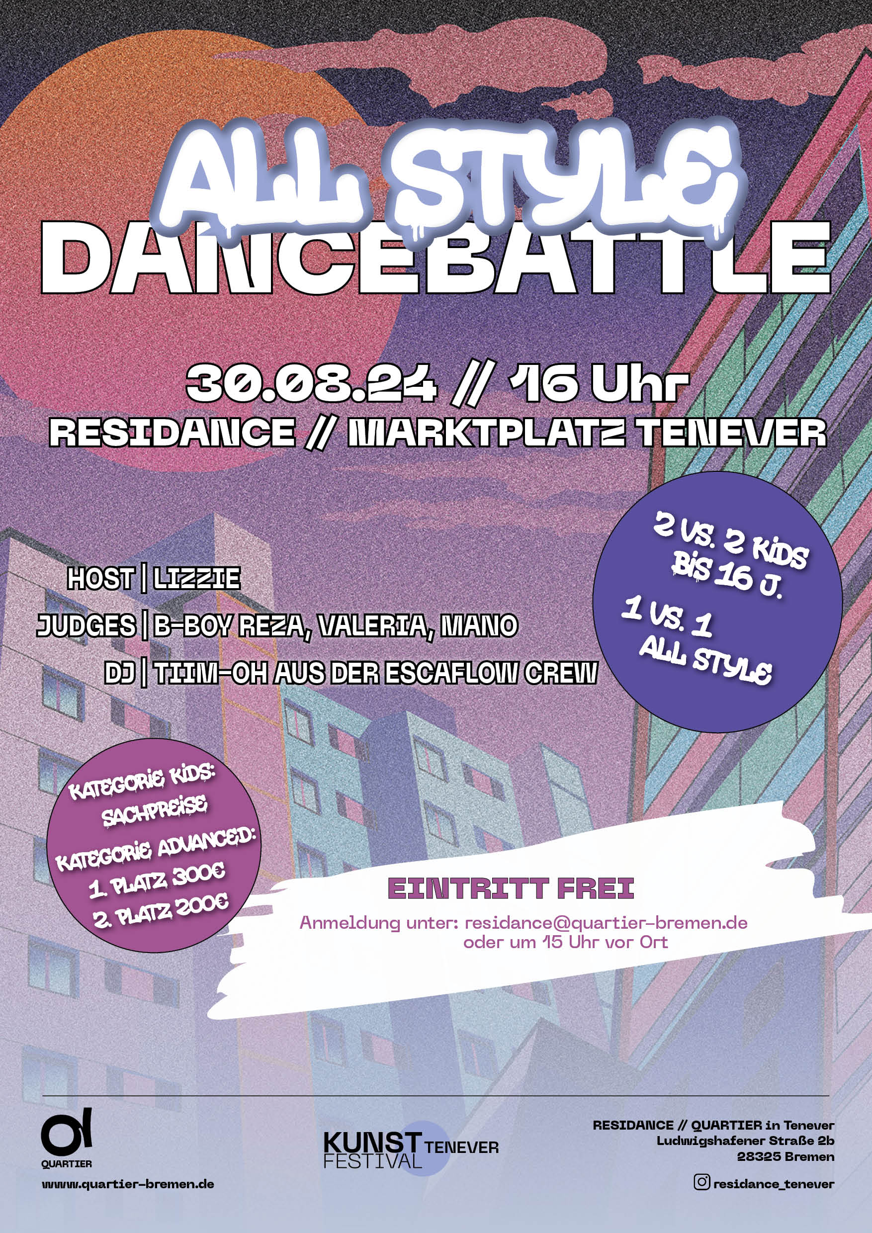 Eröffnet wurde das Festival am Freitag um 16 Uhr mit einem All Style Dancebattle in den Kategorien „2 vs. 2 Kids“ und „1 vs. 1 Advanced“. Bei blauem Himmel, lebendigem Publikum (sowohl aus Bremen als auch extra angereist), Musik des Vinyl-DJs Tiim-Oh und zwischen Hochhäusern mit atemberaubender Kulisse begann das Warm-Up um 15 Uhr. Bis in die Abendstunden tanzten die Teilnehmer:innen jeden Alters. Gegen 21:30 Uhr endete das Battle und die Tänzer:innen des 1. & 2. Platzes wurden mit Preisgeldern und Sachpreisen beschenkt.