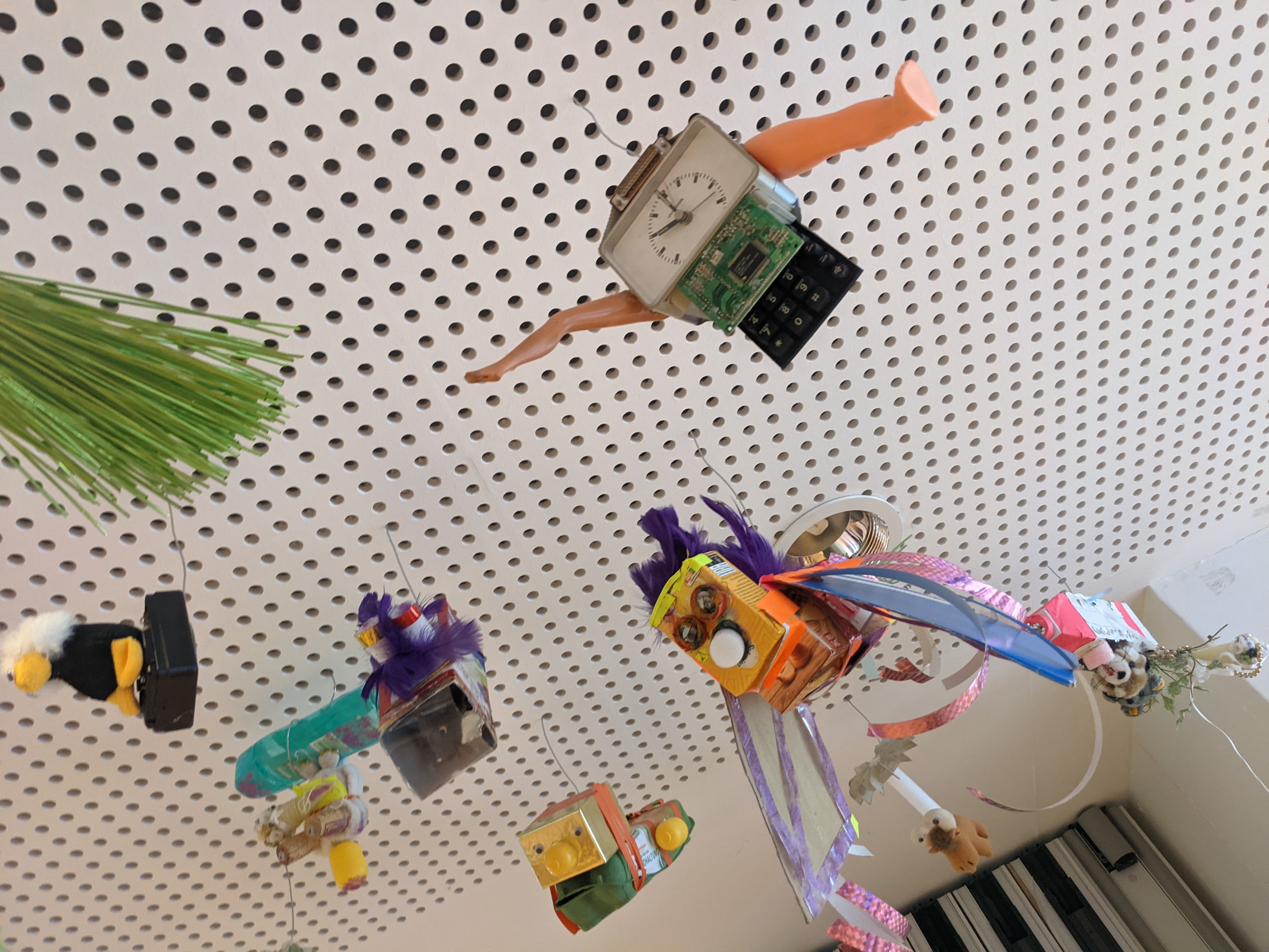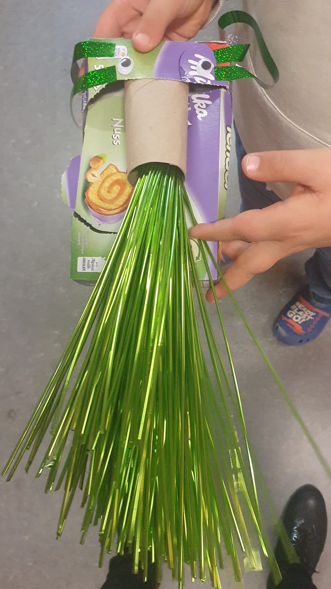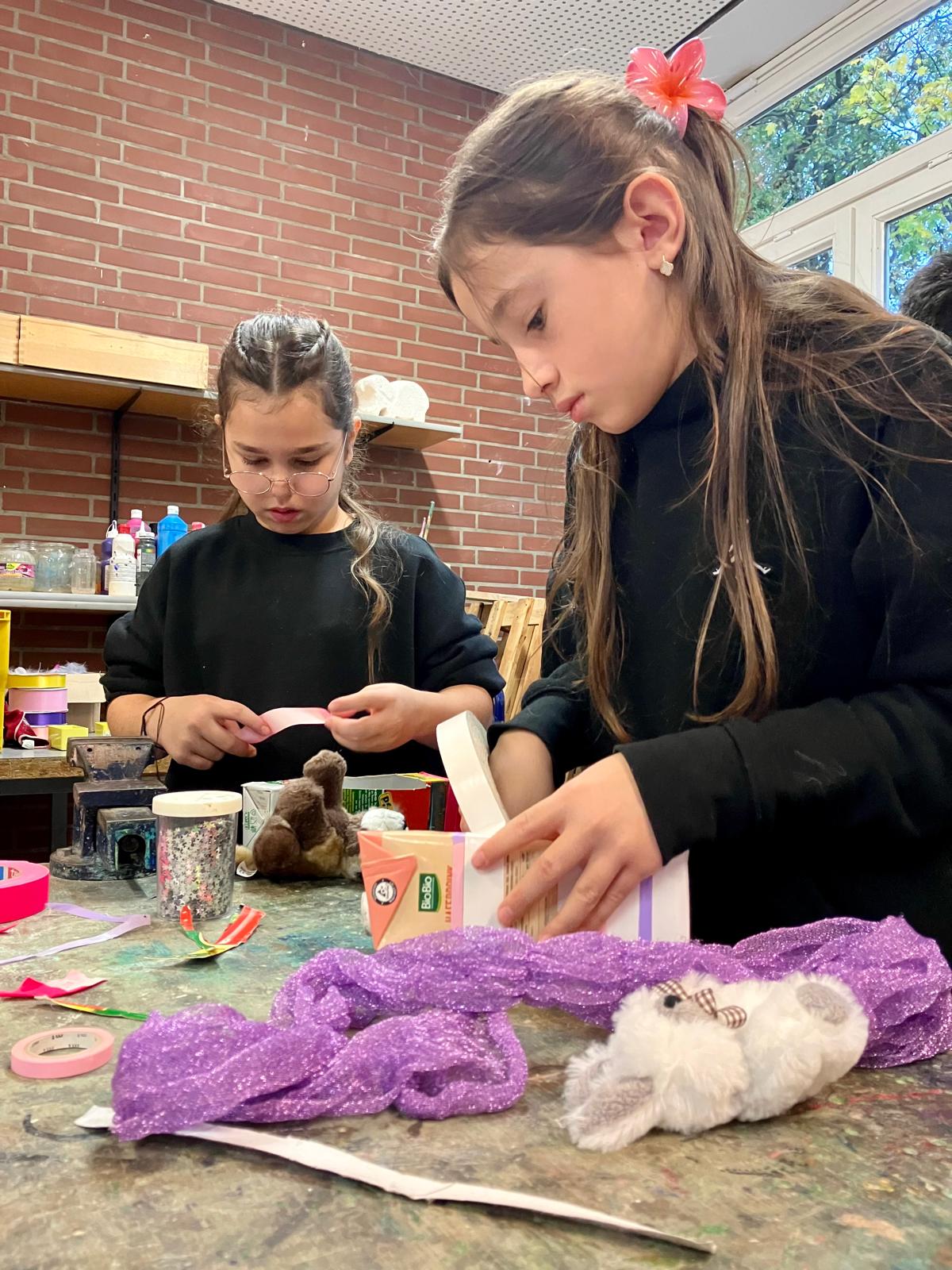 An je einem Tag arbeiteten die vierten Klassen mit den Künstler:innen Frank Bertoldi und Anja Fußbach zusammen und fertigten kleine Schwarmwesen aus Müll, Glitzerbändern und Wackelaugen.