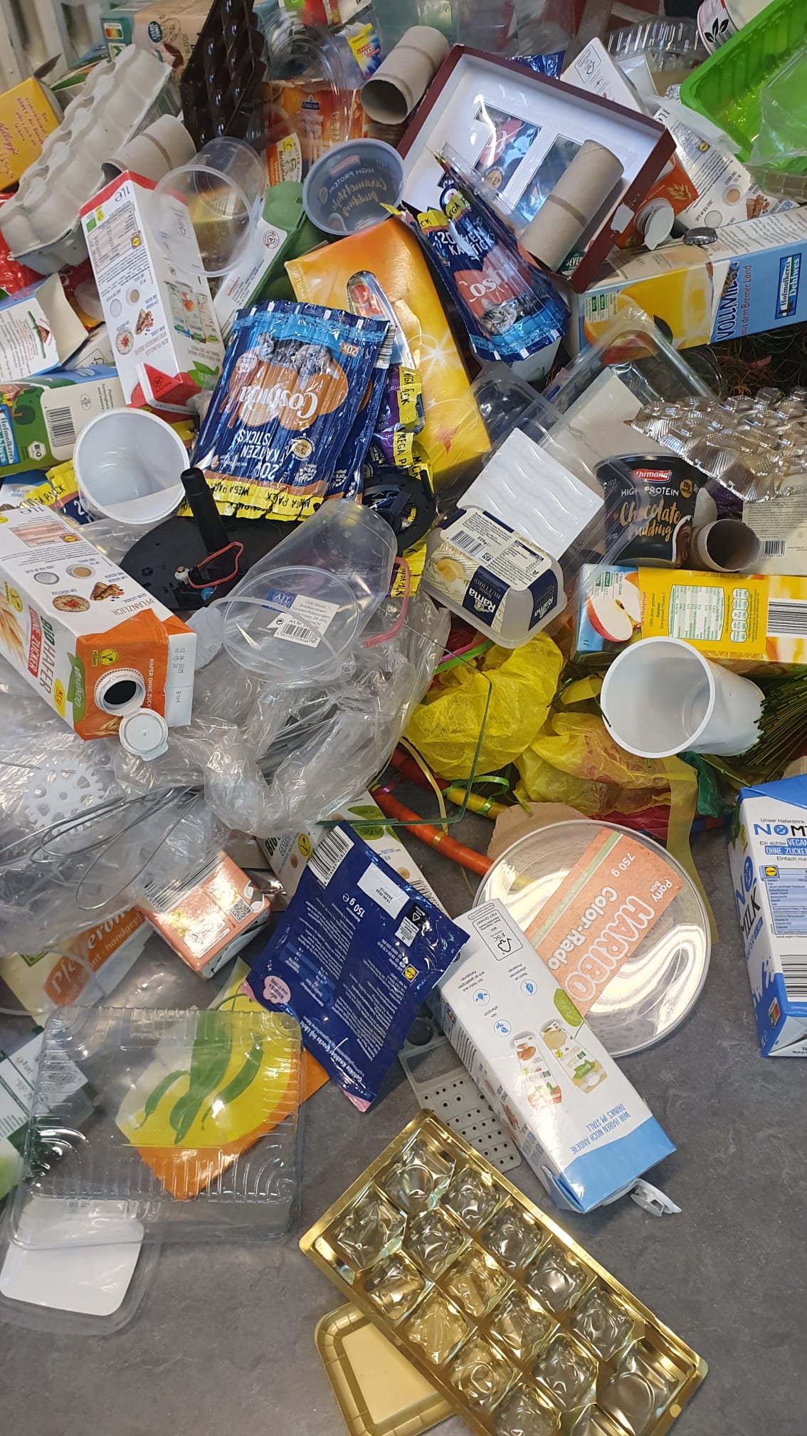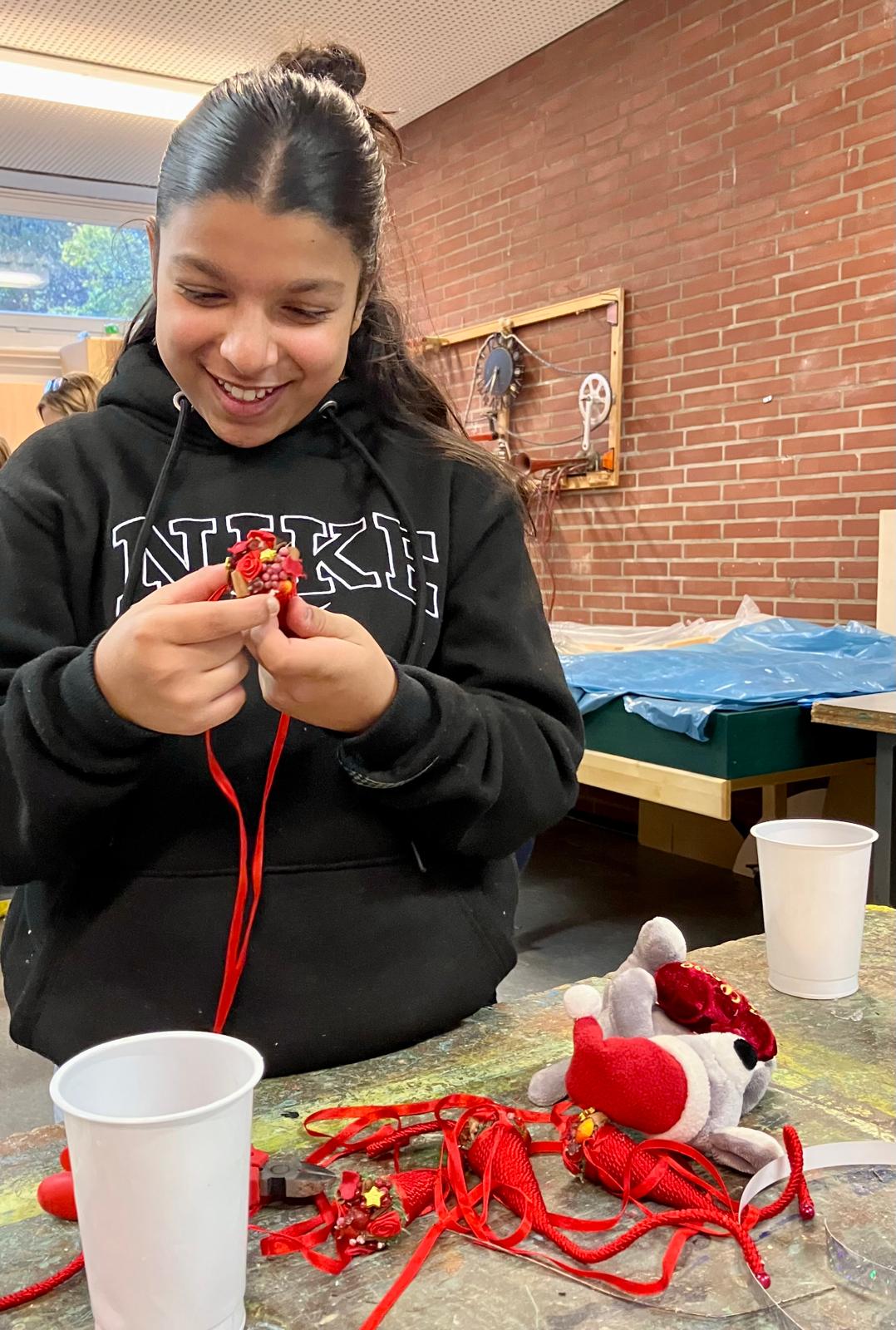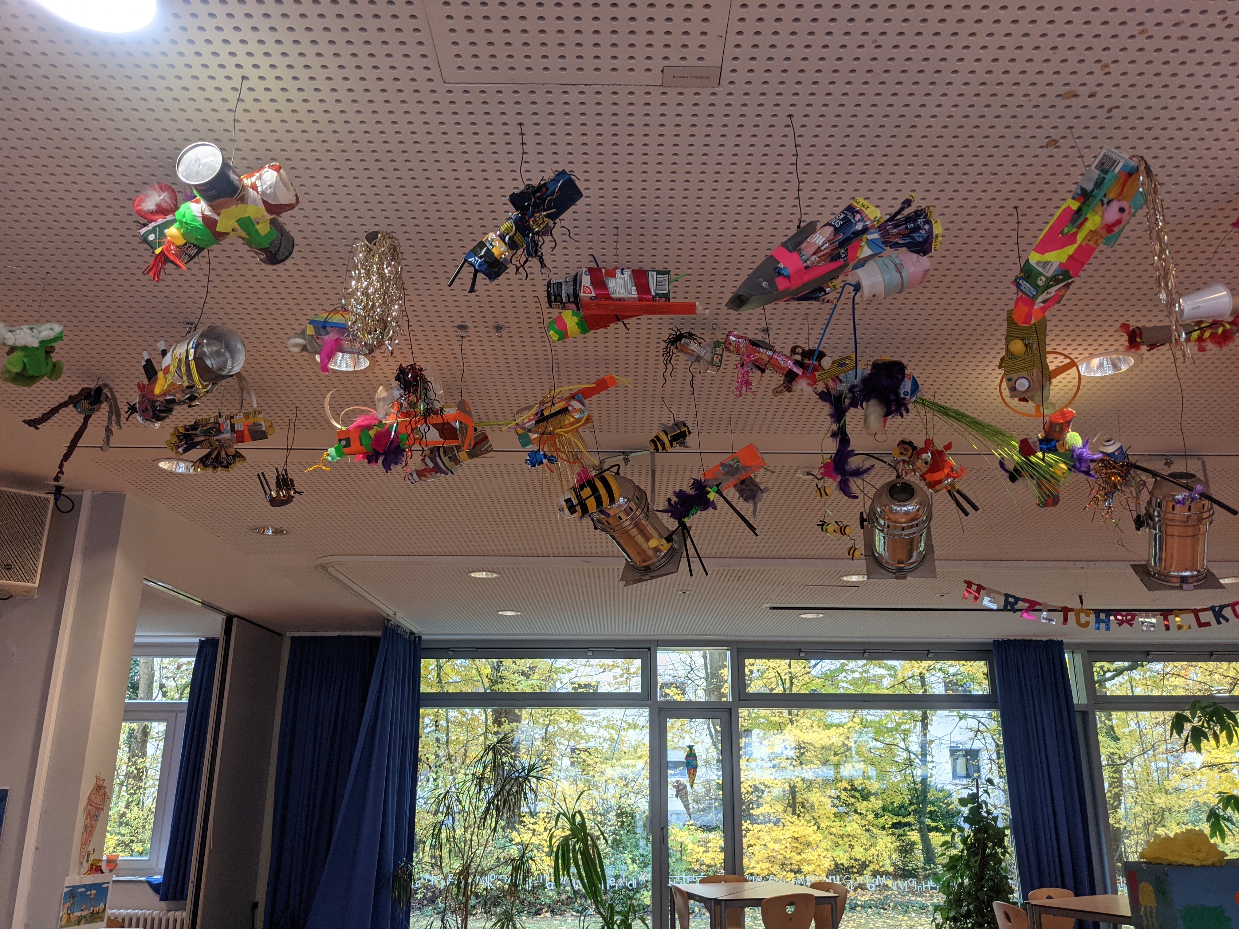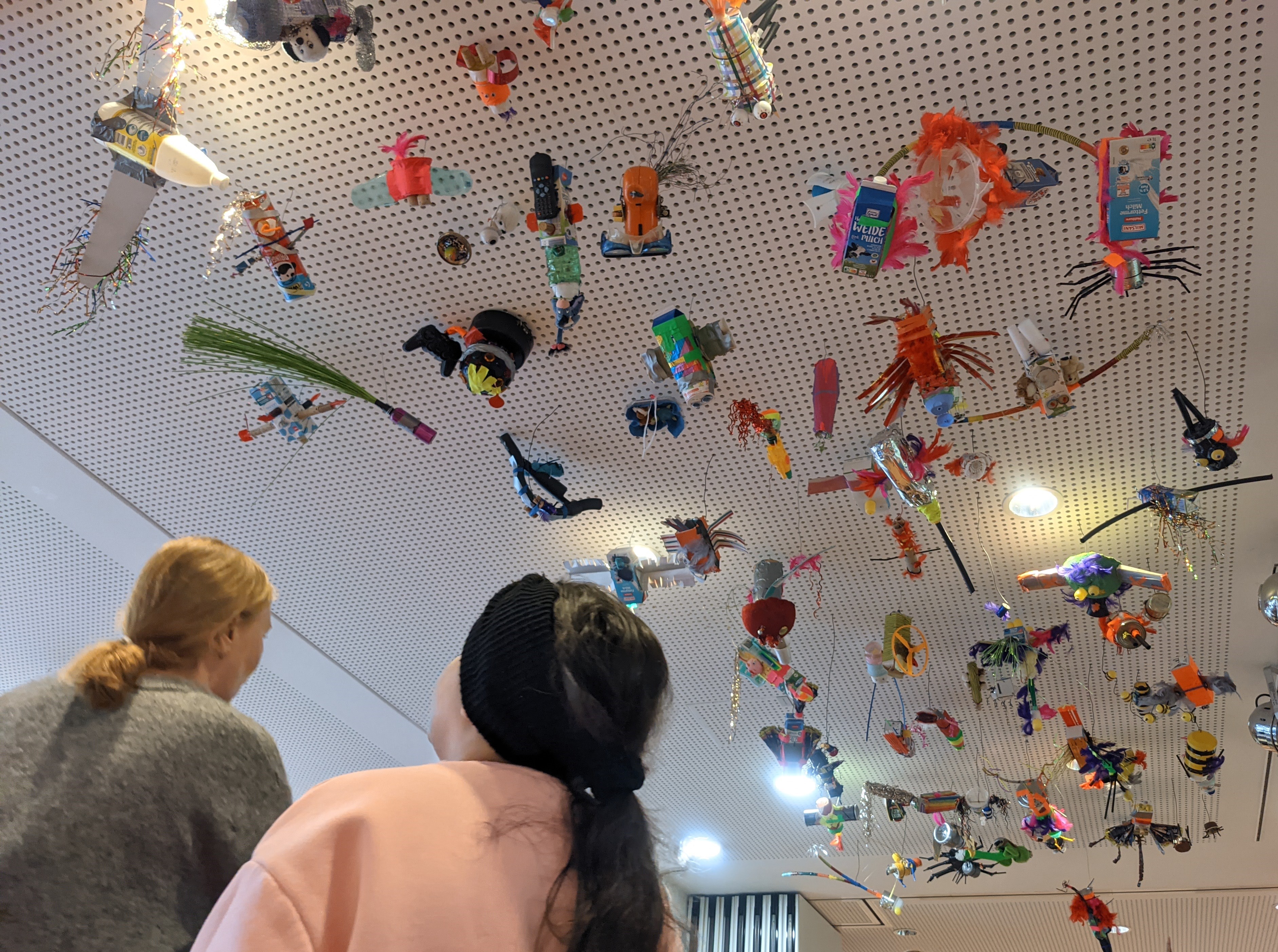 Leere Joghurtbecher, Getränkepackungen, Verpackungen von Süßigkeiten, alte Stofftiere, Festplatten, Fahrradschläuche, Korken, Klorollen und vieles mehr stapelte sich im November 2024 in der Grundschule an der Stichnathstraße. In einer Projektwoche entstand hier ein Monsterschwarm aus Müllgegenständen und Schrott, der an der Decke der Schulmensa installiert wurde.